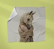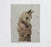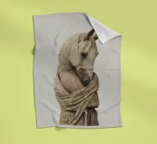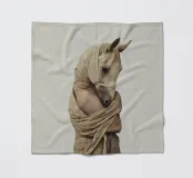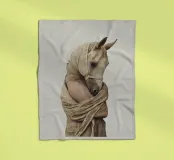 Ein surreales Bild, das eine menschliche Figur mit einem Pferdekopf darstellt, der elegant in einen strukturierten beigen Stoff gehüllt ist. Die Komposition vermittelt Mystik, Kunstfertigkeit und einen Sinn für jenseitige Symbolik und vermischt menschliche und tierische Elemente.