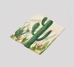 Ein stilisierter Kaktus mit drei Armen und stacheligen Details steht aufrecht. An der Basis setzt eine orangefarbene Pflanze einen kontrastreichen Farbakzent.