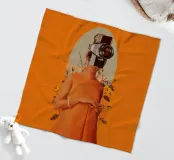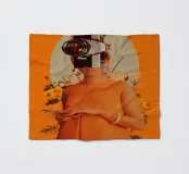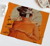Es gibt ein Foto in meinem Kopf, das jede Erinnerung an dich enthält. ~ eine Frau trägt ein orangefarbenes Kleid mit Vintage-Kamera als Kopf lebendige orange Hintergrund mit Retro-blumige Elemente.