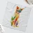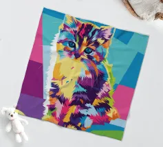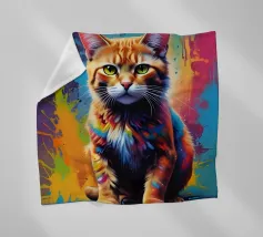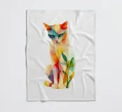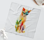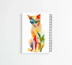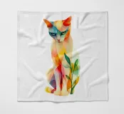Eine lebendige geometrische Illustration einer sitzenden Katze mit sich überlappenden Formen in dynamischen Farben, gepaart mit abstrakten Blattelementen für ein modernes, kreatives Design.