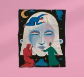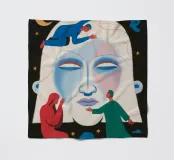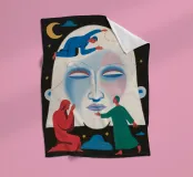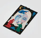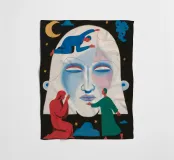 Dieses Kunstwerk zeigt zwei Figuren, eine rote und eine grüne, die unter einem Bogen mit Monden und Sternen tanzen. Der Hintergrund ist dunkelblau, was die himmlische und mystische Atmosphäre der Szene noch verstärkt.