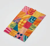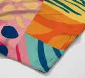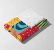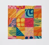 A vibrant and cheerful abstract piece resembling a patchwork quilt, with various patterns and textures in bright, sunny colors. The artwork is a joyful celebration of color and form.