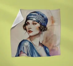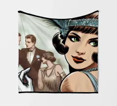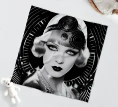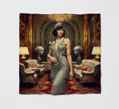 Eleganter Flapper in luxuriösem Perlenkleid, Perlen und Art Deco H... Dieses Bild zeigt ein glamouröses Flapper Girl, umgeben von opulenten metallischen Akzenten, üppigem Mobiliar und kunstvollem Dekor, das futuristische und Art-Déco-Elemente mit organischen Kurven und verträumtem Surrealismus verbindet.