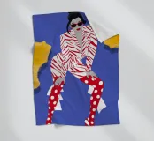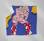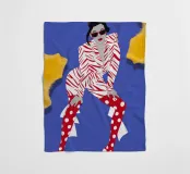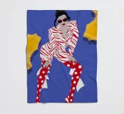 A high fashion illustration of a figure in a confident, dynamic pose, showcasing a bold clash of patterns with a geometric jacket and red polka dot pants, exuding pure energy.