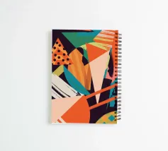 Eine energiegeladene abstrakte Komposition, in der kühne geometrische Formen, Linien und Muster in Orange, Grüntönen und Schwarz aufeinandertreffen und sich überlagern, so dass ein Gefühl von dynamischer Bewegung entsteht.