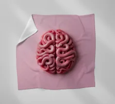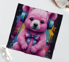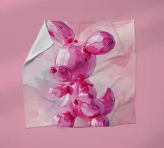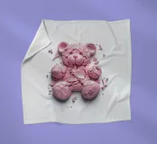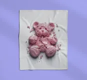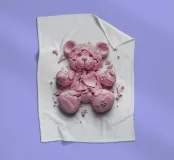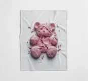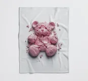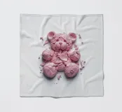 Künstlerisches Bild einer zerbrochenen rosa Teddybär-Skulptur, die so strukturiert ist, dass sie an dicke Farb- oder Tonschichten erinnert. Der Teddybär scheint zerbrochen zu sein, mit verstreuten Fragmenten, die ein Gefühl von Zerbrechlichkeit und Nostalgie hervorrufen. Dieses minimalistische, kontrastreiche Kunstwerk vor weißem Hintergrund zieht die Aufmerksamkeit des Betrachters auf sich und verbindet Elemente der kindlichen Unschuld mit Themen des Verfalls und der Vergänglichkeit. Ideal für Kunstliebhaber und Sammler, die sich für zeitgenössische Pop-Art.