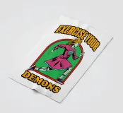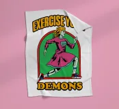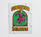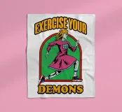 Ein dynamischer Charakter läuft mit Entschlossenheit unter der Phrase "EXERCISE YOUR DEMONS". Kräftige Farben und sportliche Kleidung verleihen dem Bild eine motivierende und temperamentvolle Ausstrahlung.