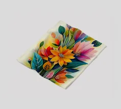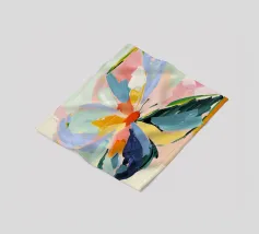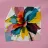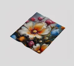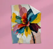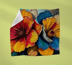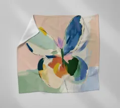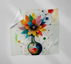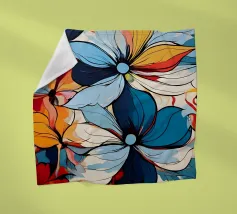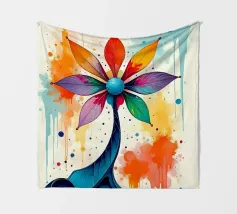 Dieses lebhafte abstrakte Gemälde zeigt eine dynamische, vielblättrige Blume, die vor kräftigen Farben strotzt, darunter tiefe Blautöne, satte Rottöne, leuchtende Gelbtöne, kräftige Orangetöne und zarte Rosatöne. Die Pinselstriche sind locker und ausdrucksstark, mit sichtbaren Texturen und Farbspritzern, die ein Gefühl von Bewegung und Spontaneität vermitteln. Ein dunkler, fast scherenschnittartiger Stiel untermalt die kaleidoskopische Farbexplosion, während Andeutungen von Weiß und gedämpfte Hintergrundtöne die lebhaften Farben richtig zur Geltung kommen lassen. Der Gesamteindruck ist der einer fröhlichen Energie und abstrakten floralen Schönheit.