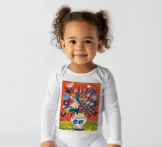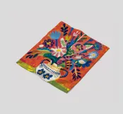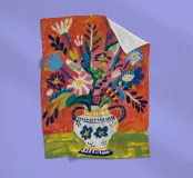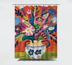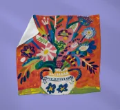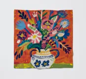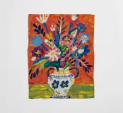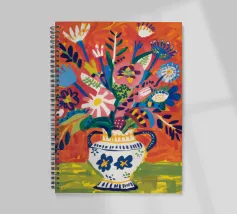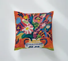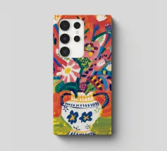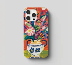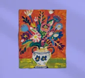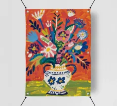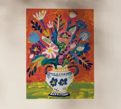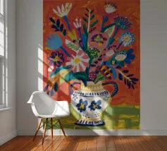 Ein dynamischer und farbenfroher Strauß aus verschiedenen abstrakten Blumen, die aus einer gemusterten Vase vor einem leuchtend roten Hintergrund explodieren und pure Freude und Energie ausstrahlen.