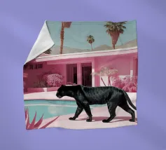 Eine nostalgische Szene aus Palm Springs: Ein rosa Flamingo schwimmt in einem türkisfarbenen Pool, umrahmt von pastellfarbenen Liegestühlen und hoch aufragenden Palmen. Dieses Kunstwerk bringt sommerliches Retro-Feeling, entspannte Urlaubsstimmung und den Charme der Jahrhundertmitte an jede Wand - ideal für Wohnzimmer, Schlafzimmer oder eine stilvolle Dekoration am Pool.
