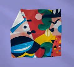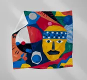 In "Geometric Whimsy" wird die überschwängliche Energie der abstrakten Kunst durch ein Kaleidoskop geometrischer Formen und lebhafter Farben eingefangen. Kreise, Dreiecke und Rechtecke tanzen in einer harmonischen Sinfonie aus Blau, Rot, Gelb, Grün und Orange über die Leinwand. Im Mittelpunkt steht ein stilisiertes gelbes Gesicht, das mit einem blau-weiß gemusterten Stirnband, schwarzen Augen und einem markanten schwarzen Schnurrbart geschmückt ist und der Komposition einen Hauch von spielerischem Charakter verleiht.