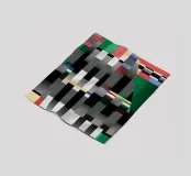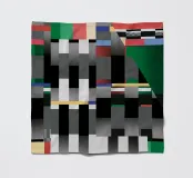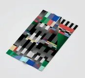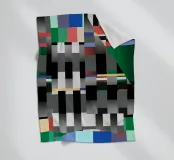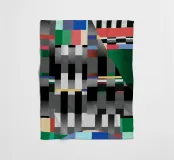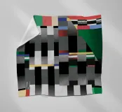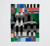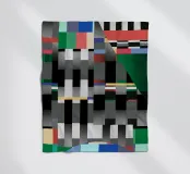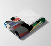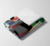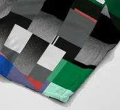 Kräftige geometrische Formen dominieren die Komposition mit einem Mix aus Farben und Mustern wie Streifen und Karomustern. Die Anordnung schafft ein lebendiges und dynamisches visuelles Erlebnis.
