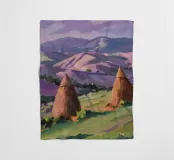 Eine ruhige Landschaft, in deren Mittelpunkt ein wohlgeformter Heuhaufen in einem Feld steht, das von sanften Hügeln in gedämpften Lila- und Grüntönen unter einem sanften, ruhigen Himmel geprägt ist.