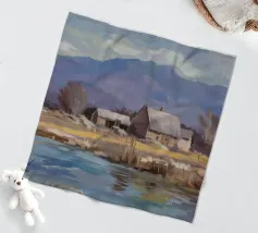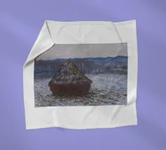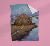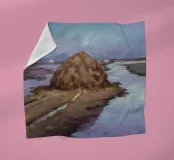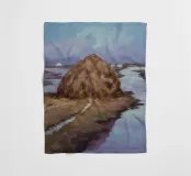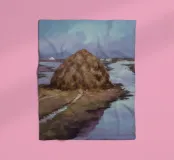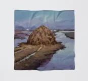 Ein Landschaftsgemälde, das einen großen Heuhaufen auf einem Feld in der Nähe eines ruhigen Flusses oder Gewässers zeigt. Der Himmel ist in einem gedämpften, bedeckten Grau gehalten, und die Gesamtpalette ist mit erdigen Tönen gedämpft.