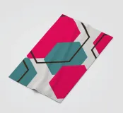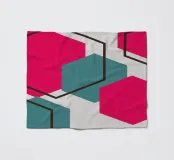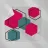 Helle Sechsecke in Rosa- und Teal-Tönen sind in einem verstreuten Muster vor einem hellgrauen Hintergrund angeordnet. Jede einfarbige Form ist mit einem sich überlappenden sechseckigen Umriss gepaart, wodurch ein mehrschichtiges und geometrisches Design entsteht.