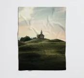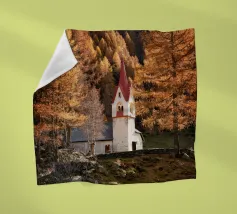 Umgeben von weiten Wiesen und sich wiegendem Gras, überblickt es das Tal mit ruhiger Anmut. Die Luft ist still, erfüllt vom Duft der Wildblumen und dem fernen Gesang der Vögel. Das schlichte Kreuz der Kapelle ragt in den Himmel, ein Symbol der Ruhe und Einsamkeit.