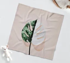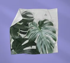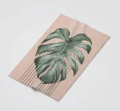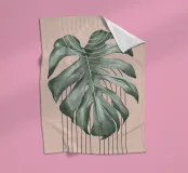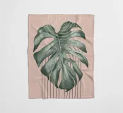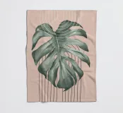 Ein großes Monstera-Blatt steht vor einem sanften beigen Hintergrund, der durch geschwungene und gerade schwarze Linien akzentuiert wird. Die sich überschneidenden Designelemente sorgen für einen modernen und minimalistischen Look.
