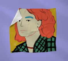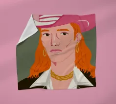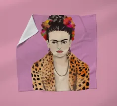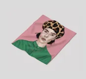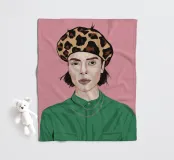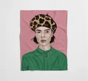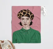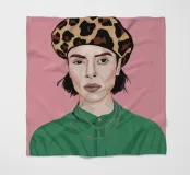 This artwork depicts a person with short hair wearing a leopard print hat and a green shirt. The background is pink, highlighting the graceful and stylish appearance of the subject.