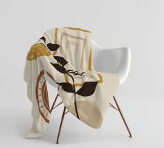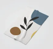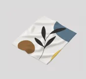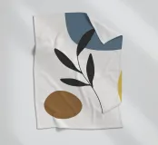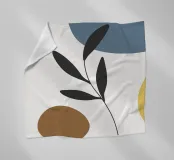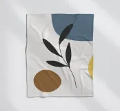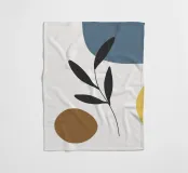 Eine minimalistische Komposition mit abstrakten Formen in Blau-, Braun- und Gelbtönen, kombiniert mit einem einfachen schwarzen botanischen Element. Die klaren Linien und die gedämpfte Farbpalette schaffen eine moderne und doch natürliche Ästhetik.