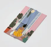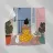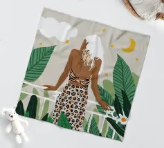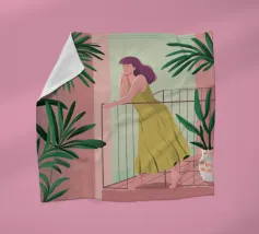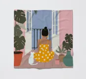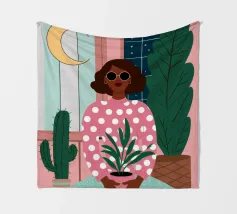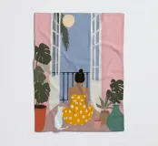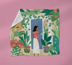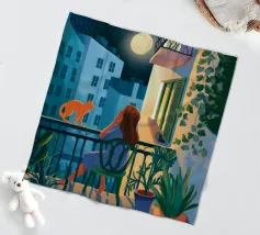 Eine ruhige Abendszene mit einer Frau und ihrer Katze, die bei offenen Türen sitzen, umgeben von üppigen Pflanzen und sanftem Mondlicht. Die sanfte Komposition wirkt verträumt und feminin mit klaren Linien und pastellfarbener Ruhe. Sie bringt ein wenig Ruhe und langsame Lebensenergie in Ihren Tag.