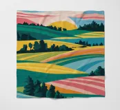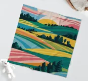 Ein ausdrucksstarkes und lebendiges Landschaftsgemälde mit hügeligen, flickenteppichartigen Feldern in Grün-, Gelb- und Rosatönen. Der malerische Stil fängt die dynamische Schönheit und Textur der Landschaft ein.