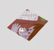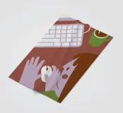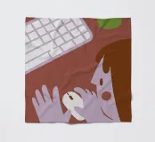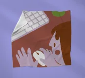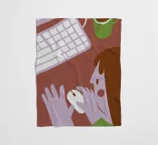 A friendly, warm-toned illustration showing someone using a computer mouse with both hands, alongside a keyboard and drink cup.