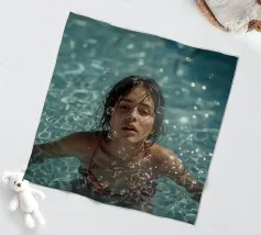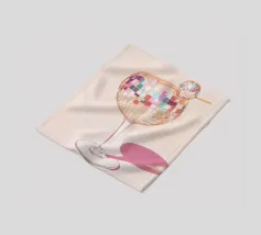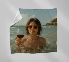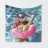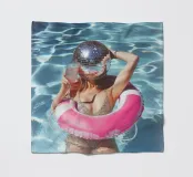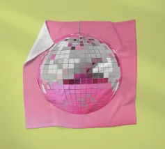 Das Bild fängt eine verspielte und surreale Szene auf einer Poolparty ein. Eine Frau schwimmt im klaren blauen Wasser und trägt einen glänzenden Discokugelhelm, in dem sich das Sonnenlicht spiegelt. Sie liegt in einem rosafarbenen aufblasbaren Ring und hält ein Glas mit einem rosafarbenen Getränk in der Hand, das die festliche Atmosphäre noch verstärkt. Ihr Badeanzug ist glitzernd und passt zur glamourösen und lustigen Stimmung der Szene. Das Wasser um sie herum glitzert, und auf seiner Oberfläche tanzen Lichtmuster, die die lebhafte und unbeschwerte Stimmung des Bildes noch verstärken.