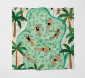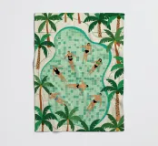 Menschen schwimmen und entspannen in einem luxuriösen Pool, der von üppigen grünen Palmen umrahmt ist. Die Szene stellt einen idyllischen tropischen Rückzugsort dar.