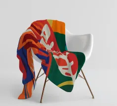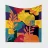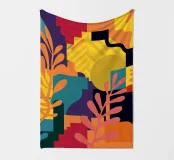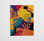 A bold abstract composition of stylized leaves and geometric shapes in primary colors of yellow, red, and blue, creating a vibrant and structured design.