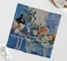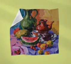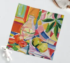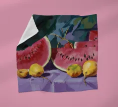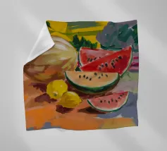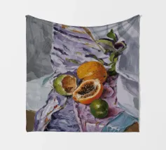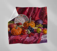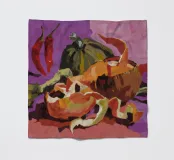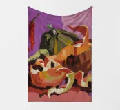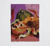 Ein Stillleben oder eine Ernteszene mit einem großen orangefarbenen Kürbis, roten Chilischoten und grünen Blättern, die möglicherweise an einer Rebe hängen. Der Hintergrund ist eine Mischung aus warmen und kühlen Tönen.