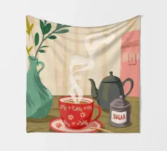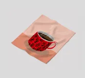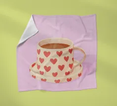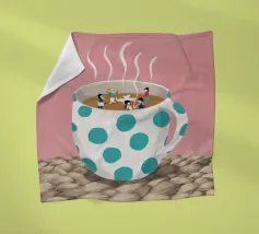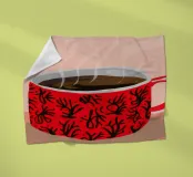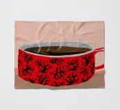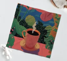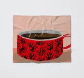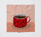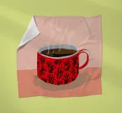 A close up illustration of a steaming hot cup of coffee or tea in a vibrant red mug with a detailed, intricate pattern. The cozy and detailed artwork is a warm invitation to take a break.