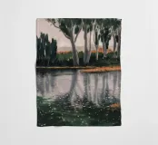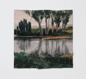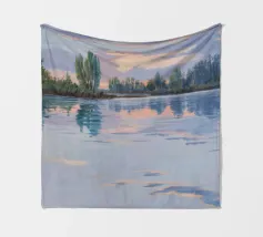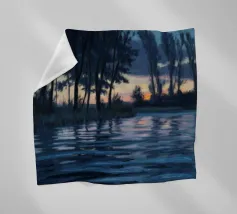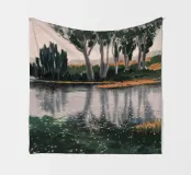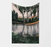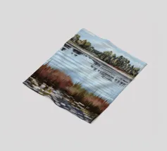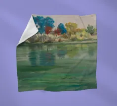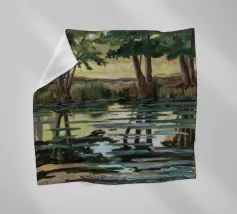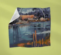 Eine ruhige Flussszene, in der die Bäume über das Wasser tanzen und sich spiegeln. Eine lyrische Landschaft voller Gleichgewicht und Harmonie.
