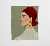 This highly elegant profile portrait showcases a woman with rich, ruby red hair meticulously styled into a bun. Her thoughtful, serene gaze, coupled with a simple gold earring against a soft green background, creates a timeless aura of classic beauty and sophistication.