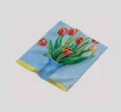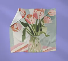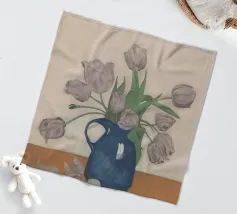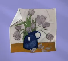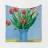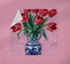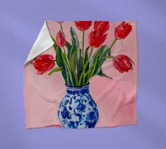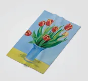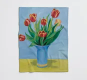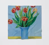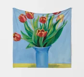 A classic still life painting of vibrant red tulips standing tall in a light blue cylindrical vase, placed on a yellow table against a complementary blue background.