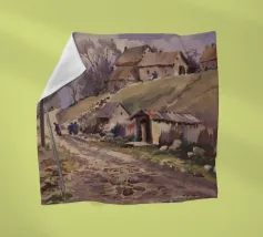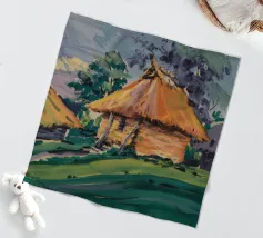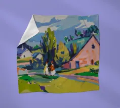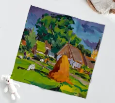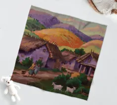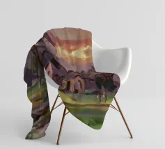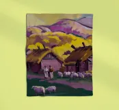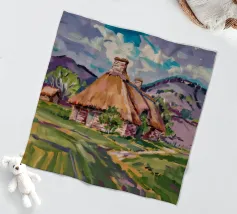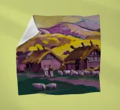 Ein lebhaftes Gemälde zeigt ein malerisches Bauernhaus mit Strohdach, umgeben von Schafen, die auf einem lila-gelben Feld grasen, mit sanften Hügeln im Hintergrund, die ein Gefühl von ländlichem Leben vermitteln.