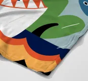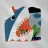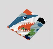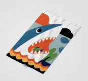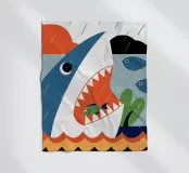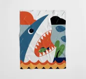 Enjoy a vibrant ocean illustration featuring a shark attacking a fish in the sea with rain and clouds in the background.