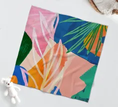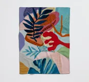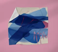 An abstract composition built with layered shapes that suggest leaves and textile patterns, in a sophisticated palette of blues, terracotta, beige, white, and a subtle hint of red.