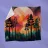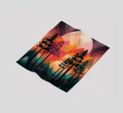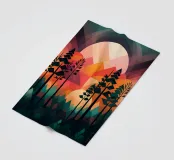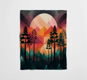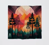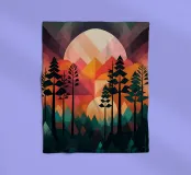 A vibrant and geometric landscape painting depicting a sunset over a forest. The bold colors and abstract shapes create a striking and modern aesthetic.
