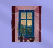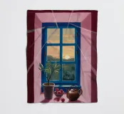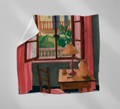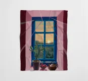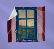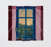 Eine ruhige Szene mit zwei Tassen Tee auf einer Fensterbank, mit Blick auf einen schönen Sonnenuntergang durch das Fenster. Die Komposition ist friedlich, romantisch und fängt einen perfekten, ruhigen Moment ein.