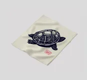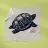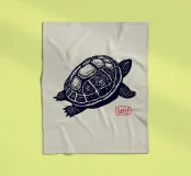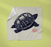 Detaillierte Schwarz-Weiß-Illustration einer Schildkröte mit komplizierter Linienführung vor einem weichen beigen Hintergrund. Ein roter Stempel mit dem Wort "Turtle" verleiht ihr eine raffinierte künstlerische Note.