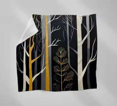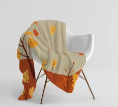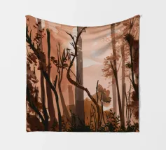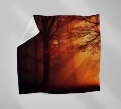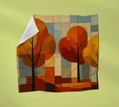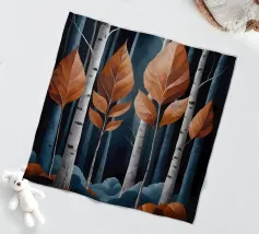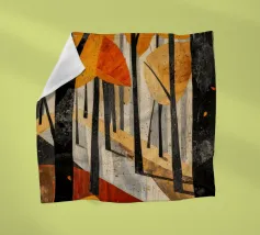 Ein digitales Gemälde eines Herbstwaldes mit dunklen Baumsilhouetten vor einem warmen, goldenen Hintergrund. Das strukturierte Kunstwerk zeigt detailliertes Laub in Orange- und Brauntönen und schafft eine ruhige und atmosphärische Waldszene.
