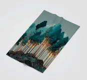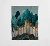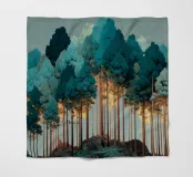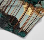 Eine traumhafte Landschaft, in der Farbe, Licht und Form in stiller Harmonie miteinander verschmelzen. Schlanke Baumstämme ragen aus einem Felsvorsprung empor und tragen ein dichtes Blätterdach aus sanft schimmernden Farbtönen, die von innen heraus leuchten. Das durch den Wald fallende Licht schafft ein Gefühl von Wärme und Erhabenheit und verwandelt die Szene in etwas Natürliches und zugleich Überirdisches.
