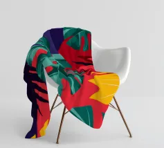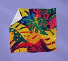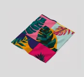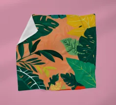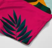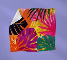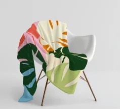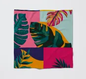 Eine raffinierte Komposition kombiniert Blöcke mit tropischen Blattmustern mit einfarbigen Feldern und geometrischen Formen. Das Patchwork-Design in Blau-, Rosa- und Grüntönen schafft ein ausgewogenes und stilvolles Stück, das sowohl modern als auch natürlich ist.