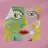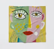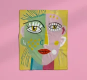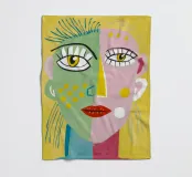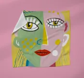 This artwork depicts a person with bright yellow hair and a colorful outfit. The background is a mix of pink and teal, adding to the whimsical feel of the painting.