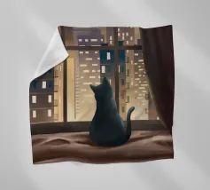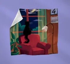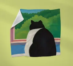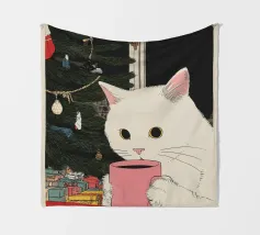 This painting portrays a white cat sitting on a windowsill, looking out at a snowy landscape with bare trees. The interior is cozy, with a cup and a piece of clothing on the windowsill, suggesting warmth and comfort inside.