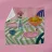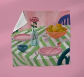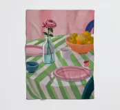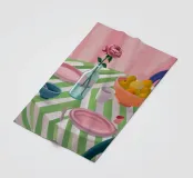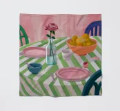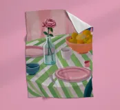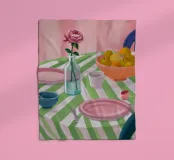 A simple and elegant still life featuring a single pink rose in a glass vase on a table with a bold green and white zigzag patterned tablecloth.