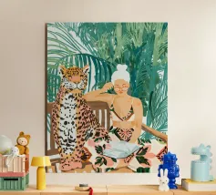 This artwork captures a person in a black dress striking a poised pose beside a leopard. The scene exudes sophistication, confidence, and timeless artistry.