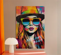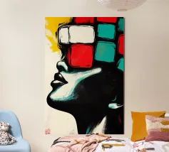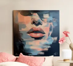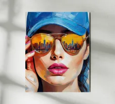 Dieses kunstvolle Porträt spielt mit Dualität und Kontrasten. Die geteilte Gesichtshälfte zeigt kühle Blautöne auf der einen und warme Erdtöne auf der anderen Seite, während die übergroße Sonnenbrille die Farbwelten reflektiert. Vertikale Farbstreifen verstärken die Symmetrie und erzeugen eine fast surrealistische Wirkung. Ein Werk, das die Wechselhaftigkeit der Wahrnehmung und die Koexistenz gegensätzlicher Emotionen einfängt.
