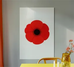 Ein einfaches Blumendesign mit rot-orangen Blütenblättern, grüner Mitte und hellgrünem Stiel verleiht ihm eine verspielte Ästhetik aus geschnittenem Papier. Die kräftigen Farben und geometrischen Formen erzeugen ein modernes und abstraktes Aussehen.