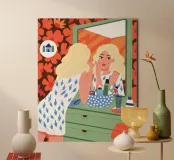 Dieses Kunstwerk zeigt eine Person mit blondem Haar, die in einen Schminkspiegel schaut. Der Hintergrund ist mit einer Blumentapete ausgefüllt, und der Frisiertisch ist mit verschiedenen Gegenständen geschmückt, wodurch eine nostalgische und intime Szene entsteht.
